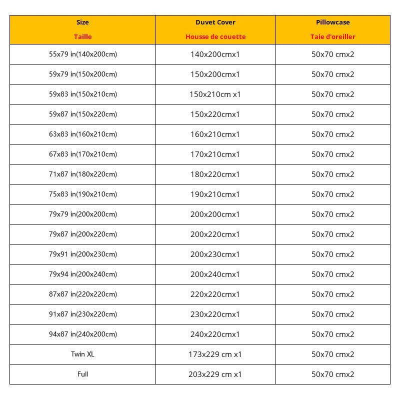 size_info: {"sizeInfoList":[{"length":{"cm":"140*200","inch":"55.12*78.74"},"size":"55x79 in(140x200cm)","vid":-1},{"length":{"cm":"150*200","inch":"59.06*78.74"},"size":"59x79 in(150x200cm)","vid":-2},{"length":{"cm":"150*210","inch":"59.06*82.68"},"size":"59x83 in(150x210cm)","vid":-3},{"length":{"cm":"150*220","inch":"59.06*86.61"},"size":"59x87 in(150x220cm)","vid":-4},{"length":{"cm":"160*210","inch":"62.99*82.68"},"size":"63x83 in(160x210cm)","vid":-5},{"length":{"cm":"170*210","inch":"66.93*82.68"},"size":"67x83 in(170x210cm)","vid":-6},{"length":{"cm":"180*220","inch":"70.87*86.61"},"size":"71x87 in(180x220cm)","vid":-7},{"length":{"cm":"190*210","inch":"74.80*82.68"},"size":"75x83 in(190x210cm)","vid":-8},{"length":{"cm":"200*200","inch":"78.74*78.74"},"size":"79x79 in(200x200cm)","vid":-9},{"length":{"cm":"200*220","inch":"78.74*86.61"},"size":"79x87 in(200x220cm)","vid":-10},{"length":{"cm":"200*230","inch":"78.74*90.55"},"size":"79x91 in(200x230cm)","vid":-11},{"length":{"cm":"200*240","inch":"78.74*94.49"},"size":"79x94 in(200x240cm)","vid":-12},{"length":{"cm":"220*220","inch":"86.61*86.61"},"size":"87x87 in(220x220cm)","vid":-13},{"length":{"cm":"230*220","inch":"90.55*86.61"},"size":"91x87 in(230x220cm)","vid":-14},{"length":{"cm":"240*220","inch":"94.49*86.61"},"size":"94x87 in(240x220cm)","vid":-15},{"length":{"cm":"173*229","inch":"68.11*90.16"},"size":"Twin Twin XL","vid":-16},{"length":{"cm":"203*229","inch":"79.92*90.16"},"size":"Full","vid":-17}]}