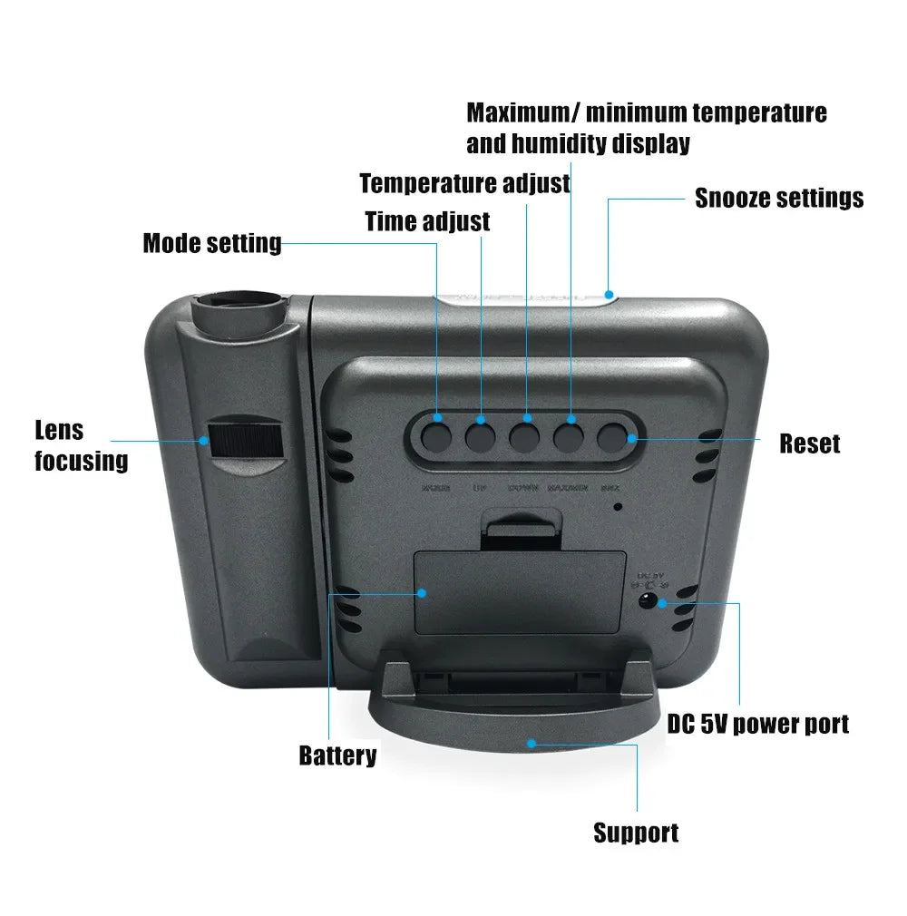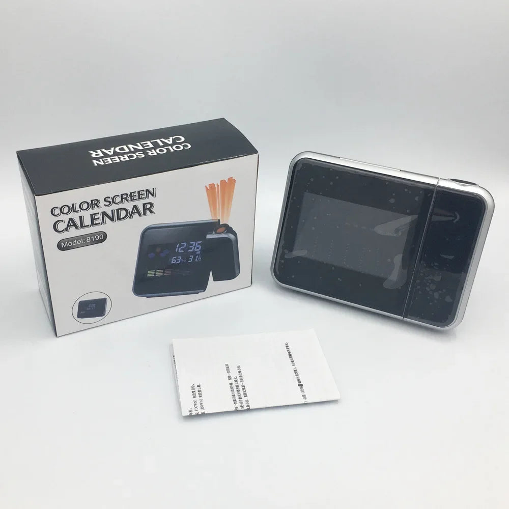 Stay informed and on schedule with this Color LCD Digital Projection Alarm Clock. It projects the time onto walls or ceilings and displays indoor temperature, humidity, and calendar info on a vibrant LED screen—perfect for your desk or bedside table.