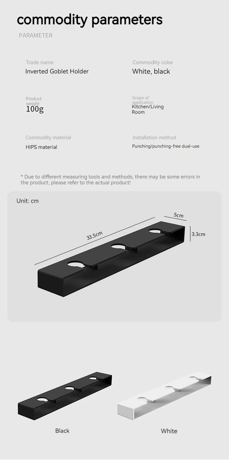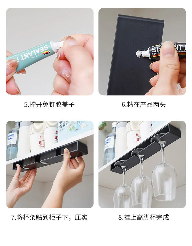 Add elegance and convenience to your home with this Punch-Free Goblet Wine Glass Hanging Rack. Designed for easy installation under cabinets or shelves, it securely holds red wine glasses upside down for efficient draining and space-saving storage—perfect for both the kitchen and living room.