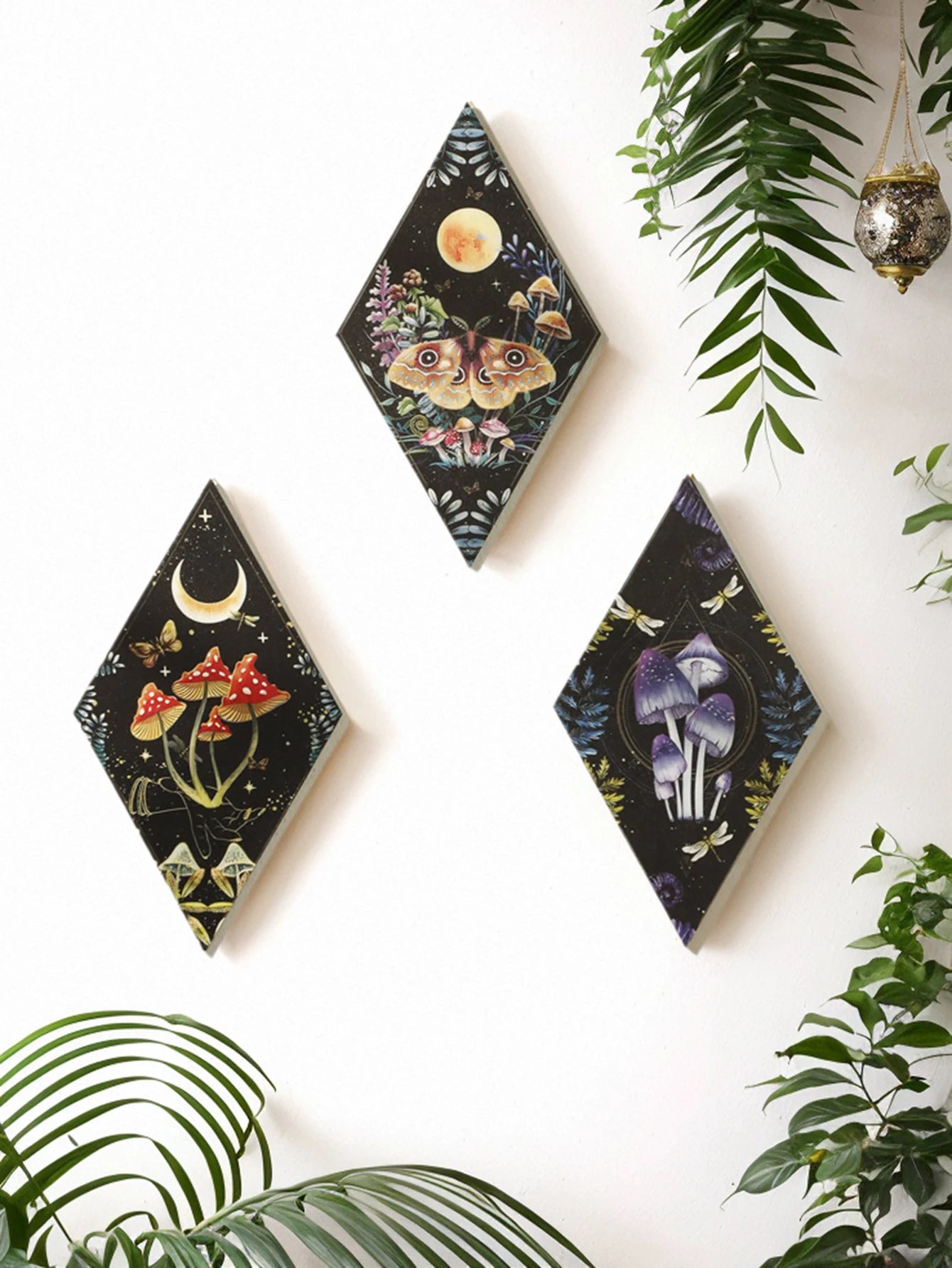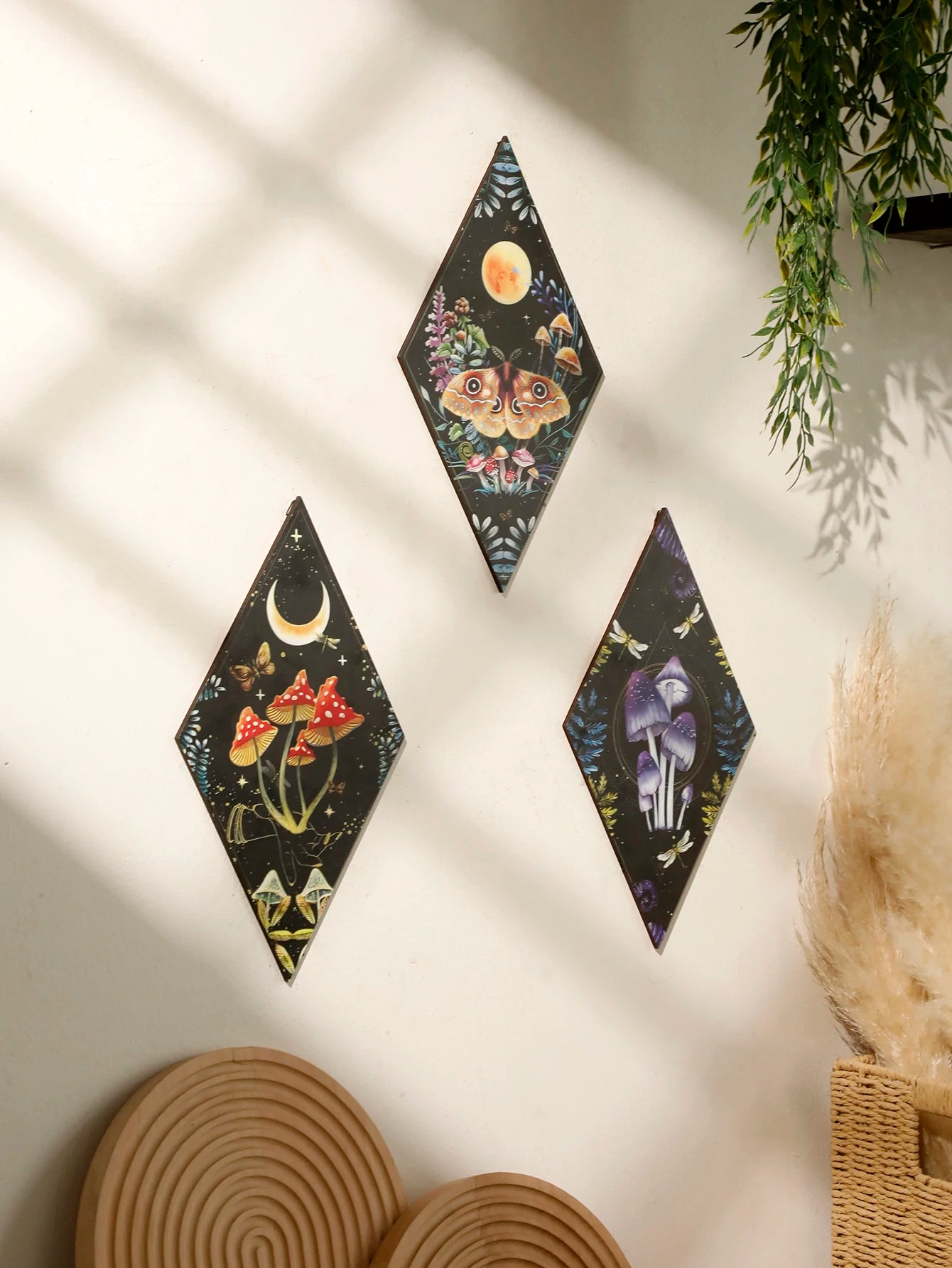 Wooden Boho Wall Hanging – Mushroom & Butterfly Pattern Rhomboid Decor for Witchy Vibes